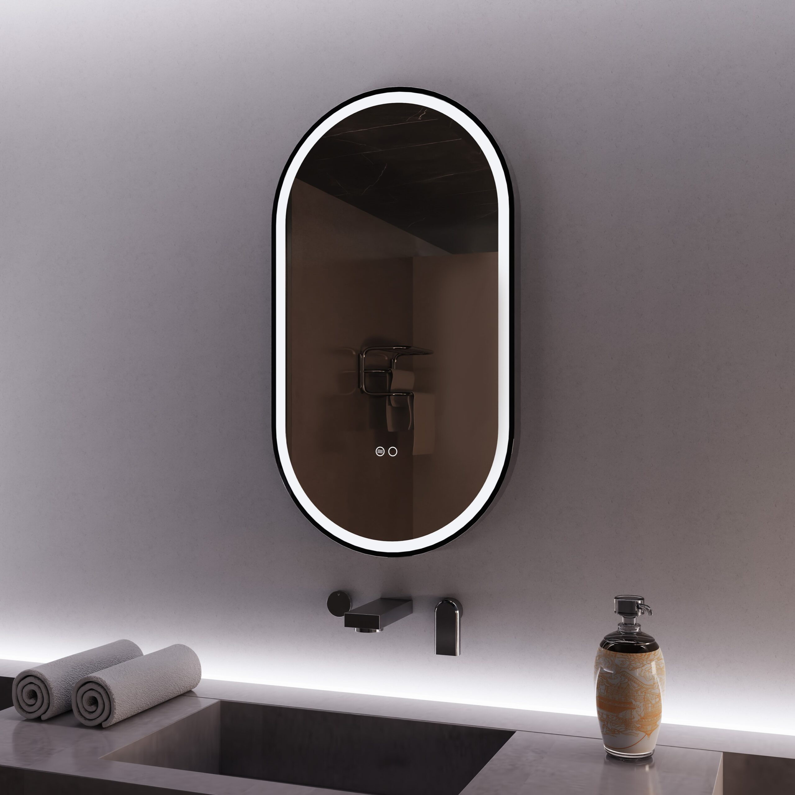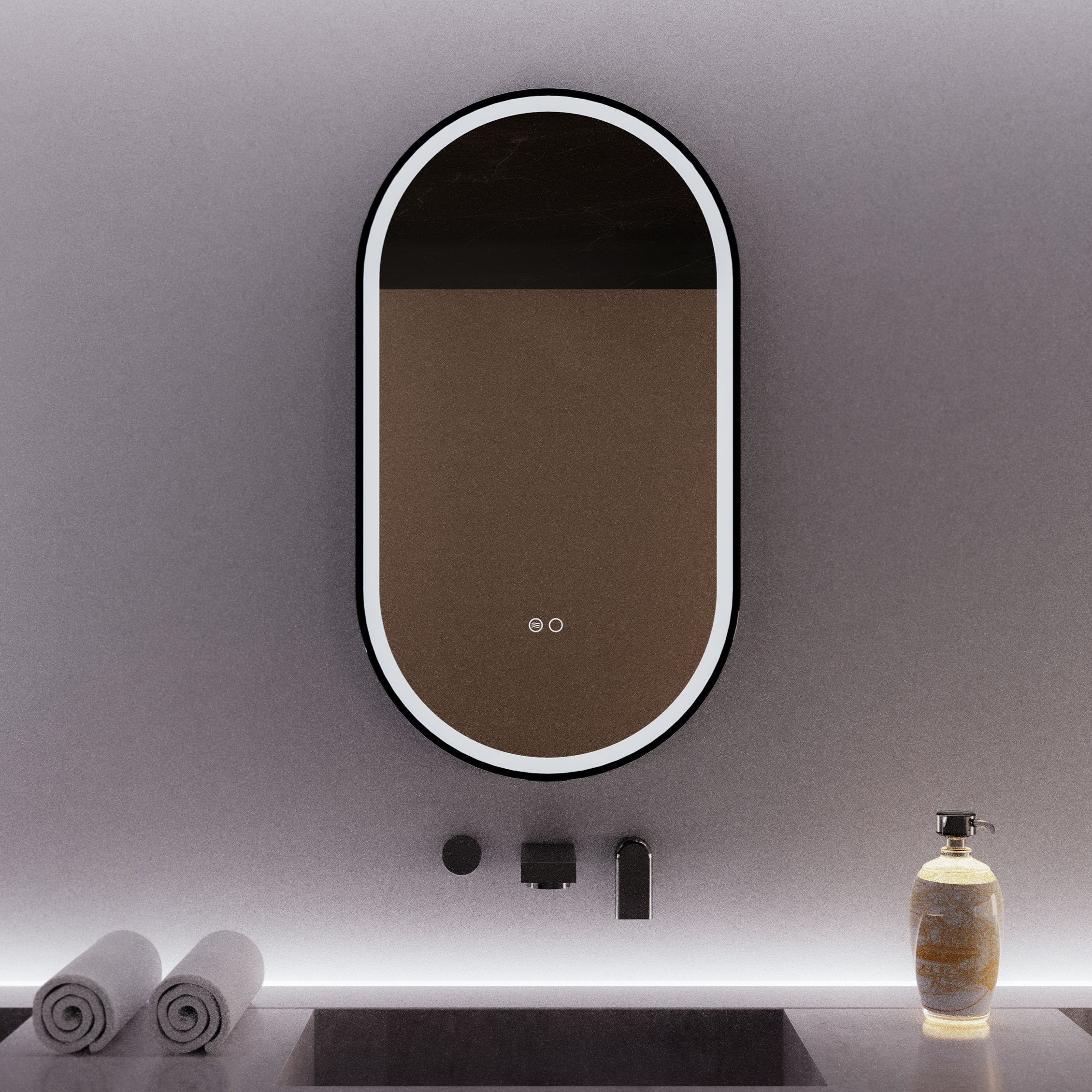 Infusing gentleness into simplicity, and aesthetics into functionality, this oval LED mirror redefines the style and practicality of modern bathrooms with its streamlined design and soft, ambient light.