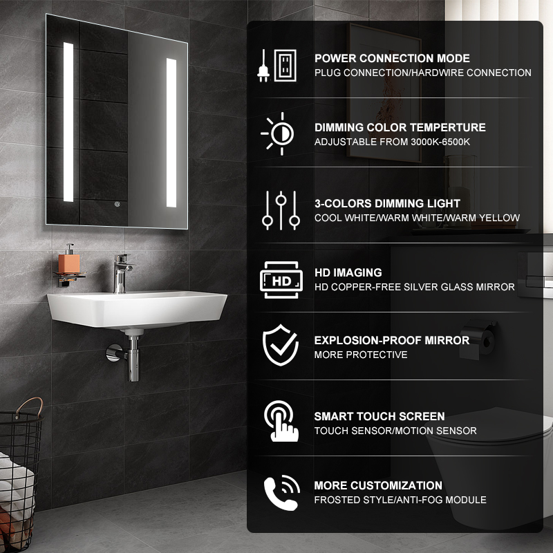 ハードワイヤード洗面台ミラーは、スペースの電気配線に直接接続されているミラーのタイプであり、洗面台エリアに恒久的でシームレスな照明ソリューションを提供します。ここにハードワイヤード洗面台のミラーのいくつかの重要な側面は、次のとおりです:ハードワイヤードの洗面台ミラーは、電気技師による専門的な設置が必要です。通常、洗面台の上の壁に取り付けるか、浴室のキャビネットに組み込みます。電気配線は壁の後ろに隠されており、その結果、清潔で整頓されたaspect.Integrated照明になります:ハードワイヤードの洗面台ミラーは、内蔵の照明オプションを備えています。LEDライトや、ミラーフレームに内蔵された電球、またはミラー面を囲む電球などです。照明はあなたのグルーミングやメイクアップのneeds.Powerソースに均一かつ十分な照明を提供するように設計されています:電源コードとコンセントを必要とするプラグインの洗面台ミラーとは異なり、ハードワイヤード・ミラーは、建物の電気系統から直接電源を引き込みます。これは目に見えるコードのための必要性を除去し、乱雑なしの虚栄心の区域を可能にします。