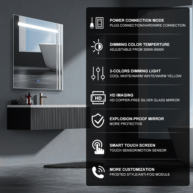 ハードワイヤードバニティミラーは、空間の電気配線に直接接続され、恒久的にインストールされているミラーのタイプです。バスルームやドレッシングルームなどの洗面台で使用するために特別に設計されており、グルーミングやメイクアップ、その他のパーソナルケアのルーチンに最適な照明を提供します。以下は、ハードワイヤードの洗面台のミラーのいくつかの重要な側面です:ハードワイヤの洗面台ミラーは、電気技師による専門的な設置が必要です。通常、洗面台やカウンターの上の壁に取り付けられ、建物の電気システムに接続されます。配線は壁の後ろに隠され、クリーンでシームレスなinstallation.Integrated照明になります:ハードワイヤードの洗面台用ミラーは、一般的にLEDライトの形をした内蔵照明エレメントを備えており、身だしなみを整える作業に均一で十分な明るさを提供します。ライトはミラーの周りに戦略的に配置され、影を最小限に抑え、十分な明るさの反射を提供します:プラグイン式や電池式の洗面鏡とは異なり、ハードワイヤー式は建物の電気系統から直接電力を取り込みます。これは目に見えるコードの必要性を除去し、信頼でき、連続的な電源を保障する。